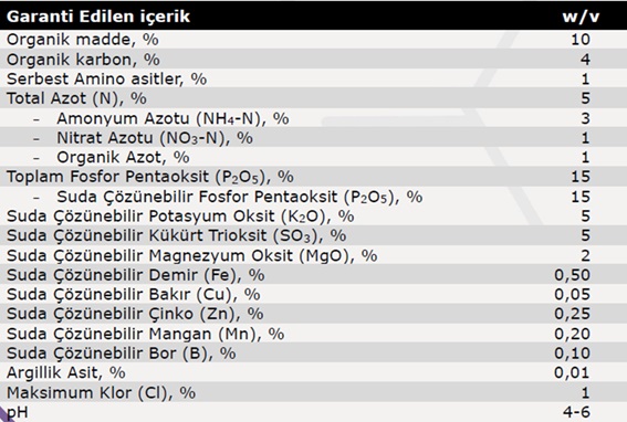 OrganoPlantis PhosPro, organik madde (%10), N-P-K (5-15-5) yapısına ek olarak kükürt, magnezyum, mikroelementler (Fe, Zn, Cu, Mn, B), serbest amino asitler ve argillik asit içerir.