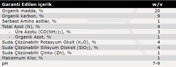 OrganoPlantis ZinSil, organik madde (%20), N-K (4-0-4) yapısına ek olarak silisyum (%4), Çinko (%1), serbest amino asitler ve argillik asit içerir.