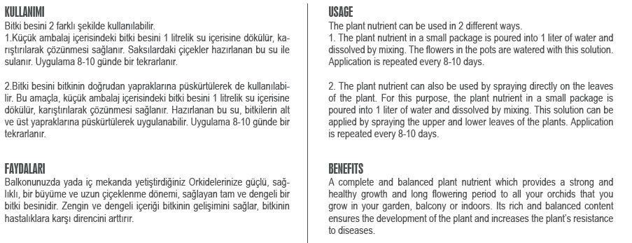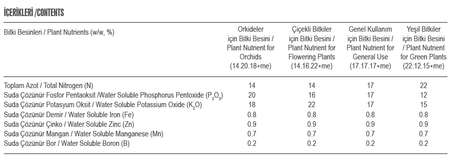 Dört tip ürün vardır. Bunlar; 1- Yeşil bitkiler için bitki besini (22-12-15+me), 2- Çiçekli bitkiler için bitki besini (14-18-22+me), 3-Genel kullanım için bitki besini (17-17-17+me), 4-Orkideler için bitki besini (14-20-18+me)