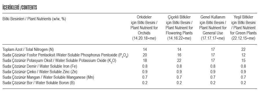 Dört tip ürün vardır. Bunlar; 1- Yeşil bitkiler için bitki besini (22-12-15+me), 2- Çiçekli bitkiler için bitki besini (14-18-22+me), 3-Genel kullanım için bitki besini (17-17-17+me), 4-Orkideler için bitki besini (14-20-18+me)