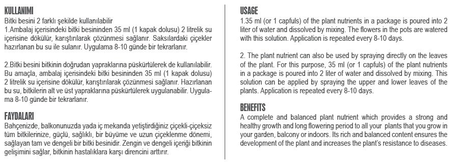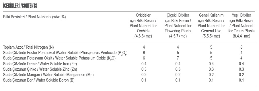 Dört tip ürün vardır. Bunlar; 1- Yeşil bitkiler için bitki besini (8-4-4+me), 2- Çiçekli bitkiler için bitki besini (4-5-7+me), 3-Genel kullanım için bitki besini (5-5-5+me), 4-Orkideler için bitki besini (4-6-6+me)