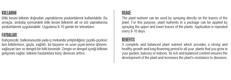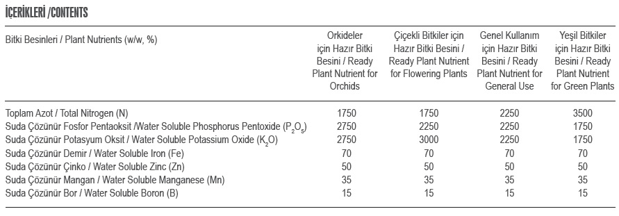 Dört tip ürün vardır. Bunlar; 1- Yeşil bitkiler için hazır bitki besini, 2- Çiçekli bitkiler için hazır bitki besini, 3-Genel kullanım için hazır bitki besini, 4-Orkideler için hazır bitki besini