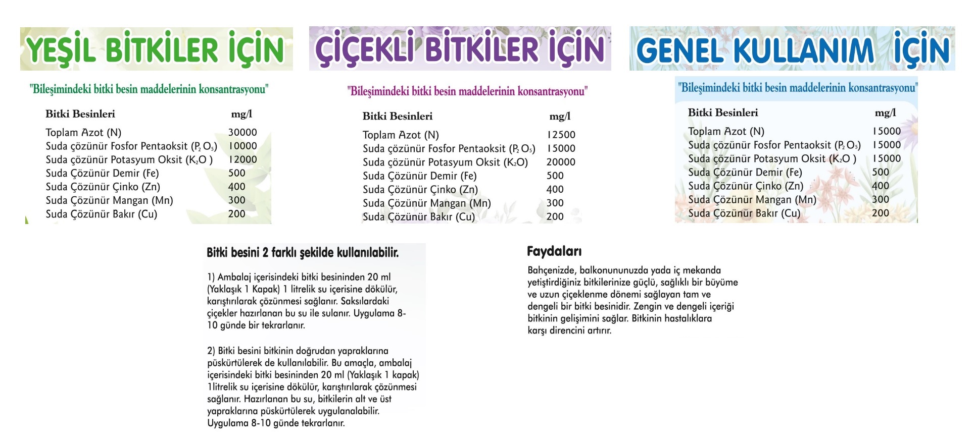 Altı tip tip ürün vardır. Bunlar; 1-Yeşil bitkiler için bitki besini, 2-Çiçekli bitkiler için bitki besini, 3-Genel kullanım için bitki besini, 4-Orkideler için bitki besini, 5-Sararan bitkiler için bitki besini, 6-Kaktüs ve Sukulentler için bitki besini