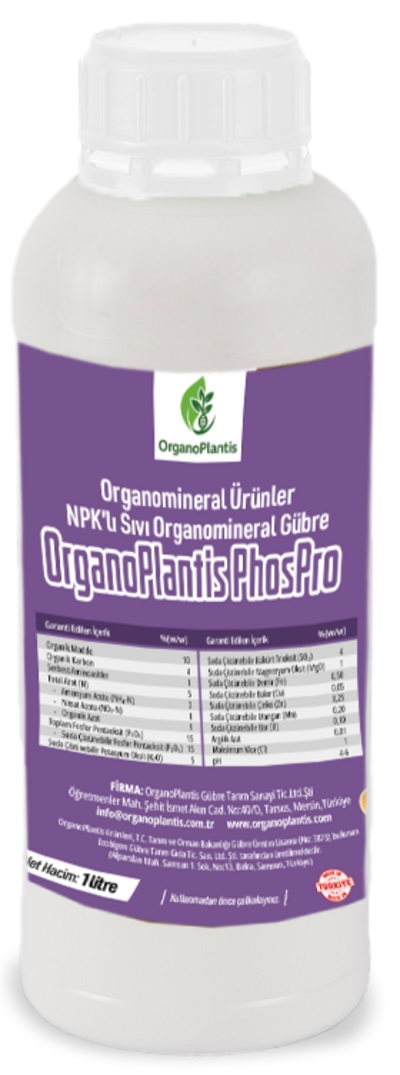 OrganoPlantis PhosPro, organik madde (%10), N-P-K (5-15-5) yapısına ek olarak kükürt, magnezyum, mikroelementler (Fe, Zn, Cu, Mn, B), serbest amino asitler ve argillik asit içerir.