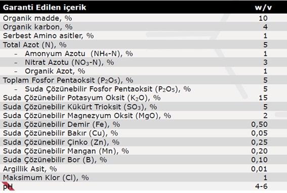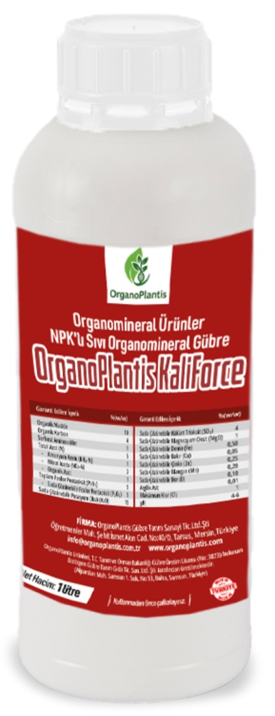 OrganoPlantis KaliForce, organik madde (%10), N-P-K (5-5-15) yapısına ek olarak kükürt, magnezyum, mikroelementler (Fe, Zn, Cu, Mn, B), serbest amino asitler ve argillik asit içerir.